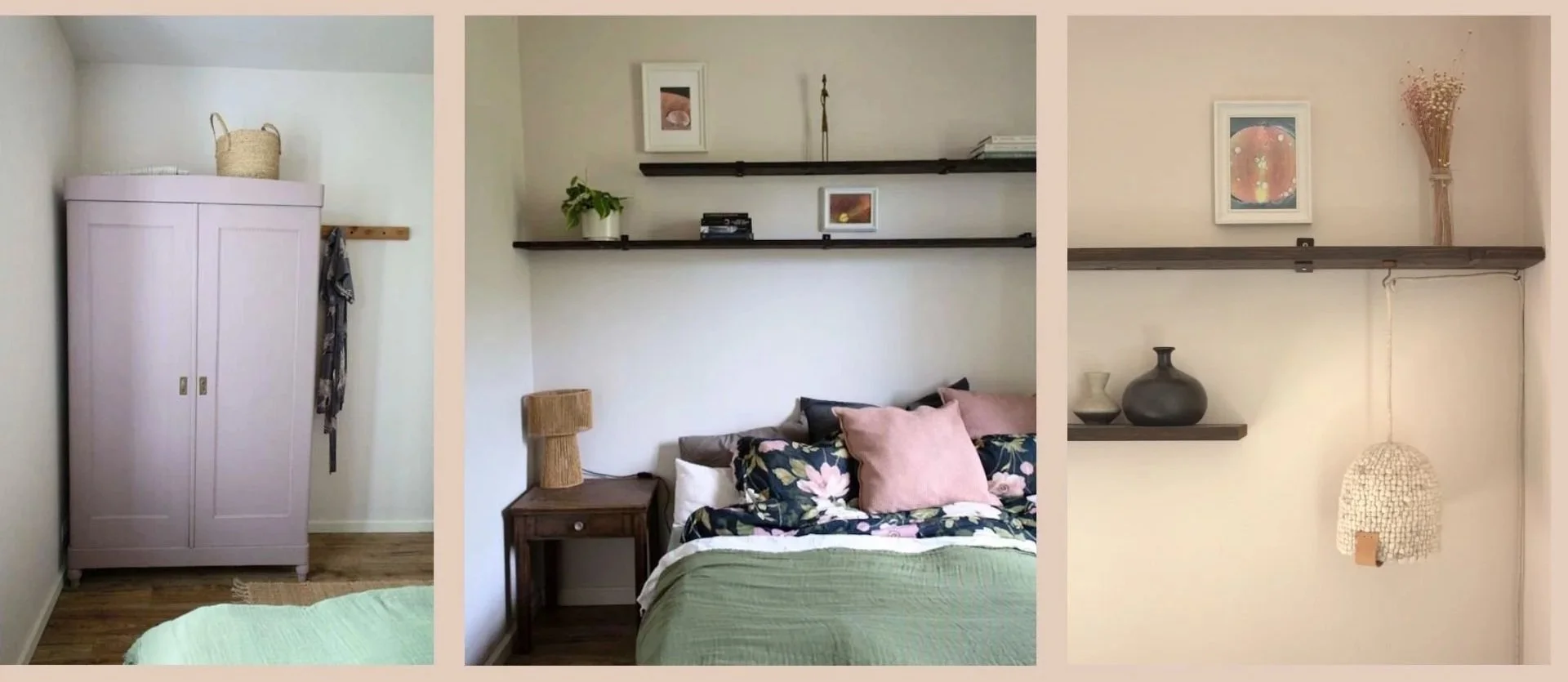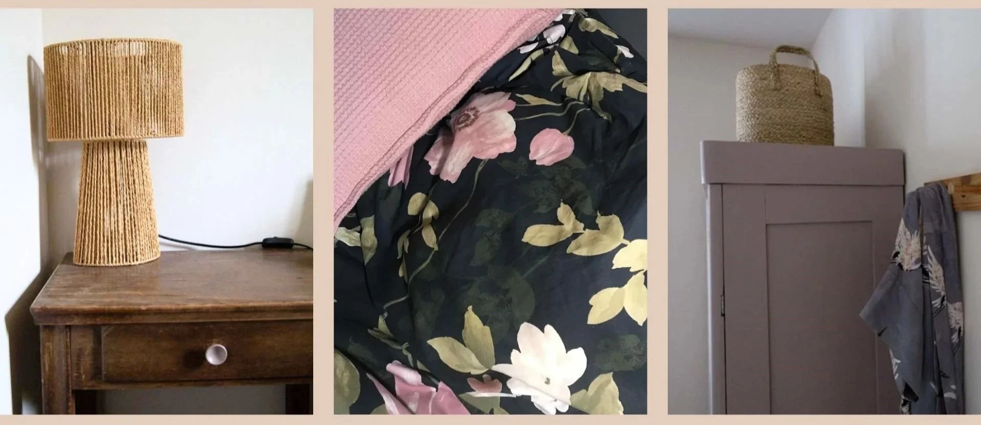 A felújítást a hálószobával kezdtük. A virágos ágynemű, a százéves mályva szekrény és két sötétbarna, égetés elől megmentett kis éjjeli asztalka adták a kiindulópontot.